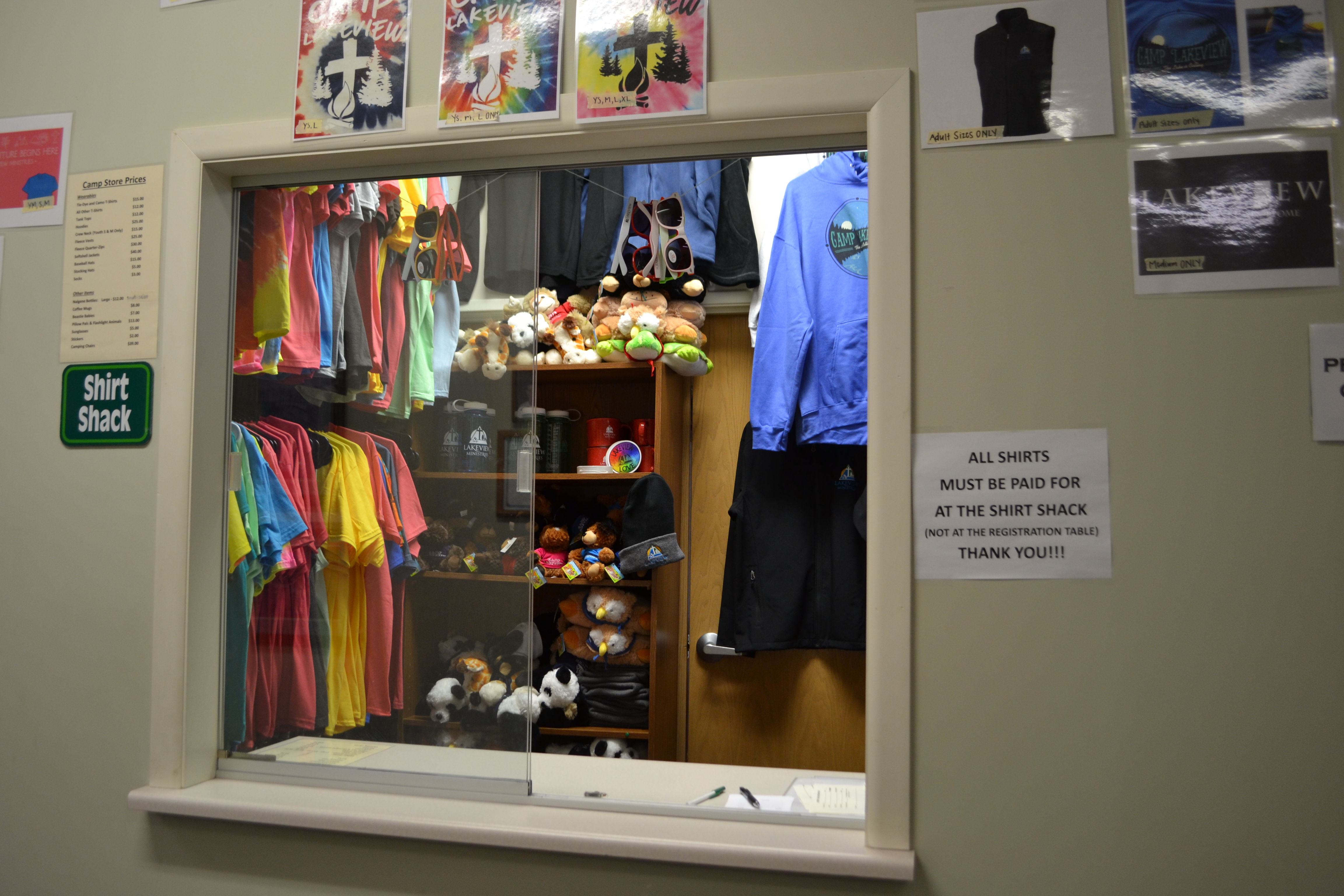 The shirt shack is open year-round for guests and summer campers to purchase t-shirts, sweatshirts, hats, water bottles, stuffed animals, and other camp souvenirs.